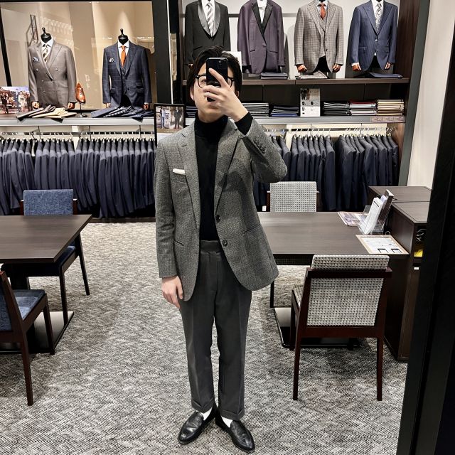 本日はグレーのジャケパンスタイルで出勤しております。