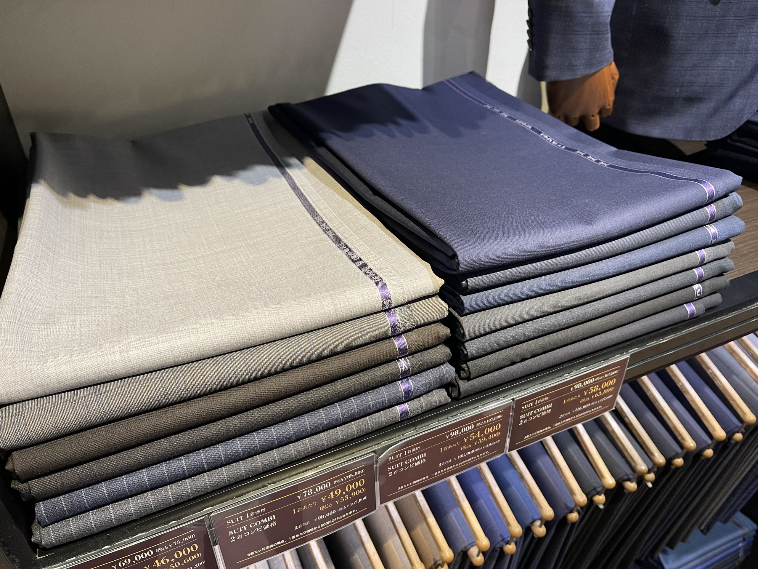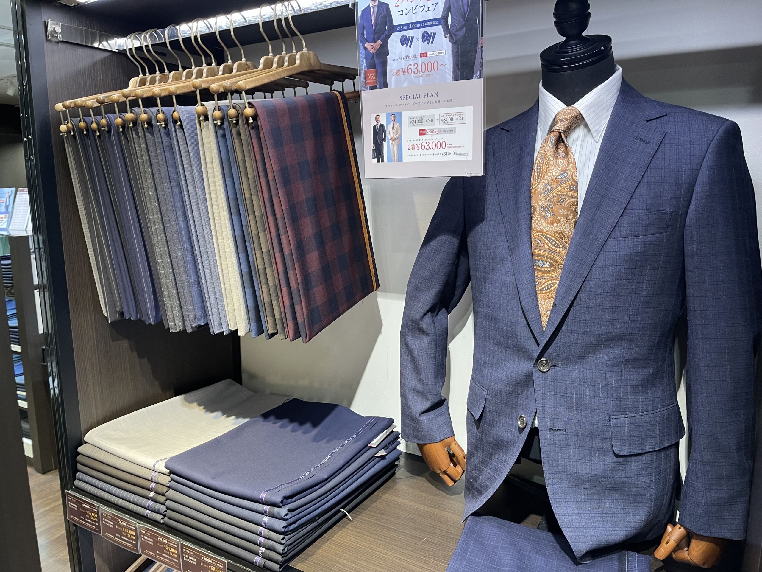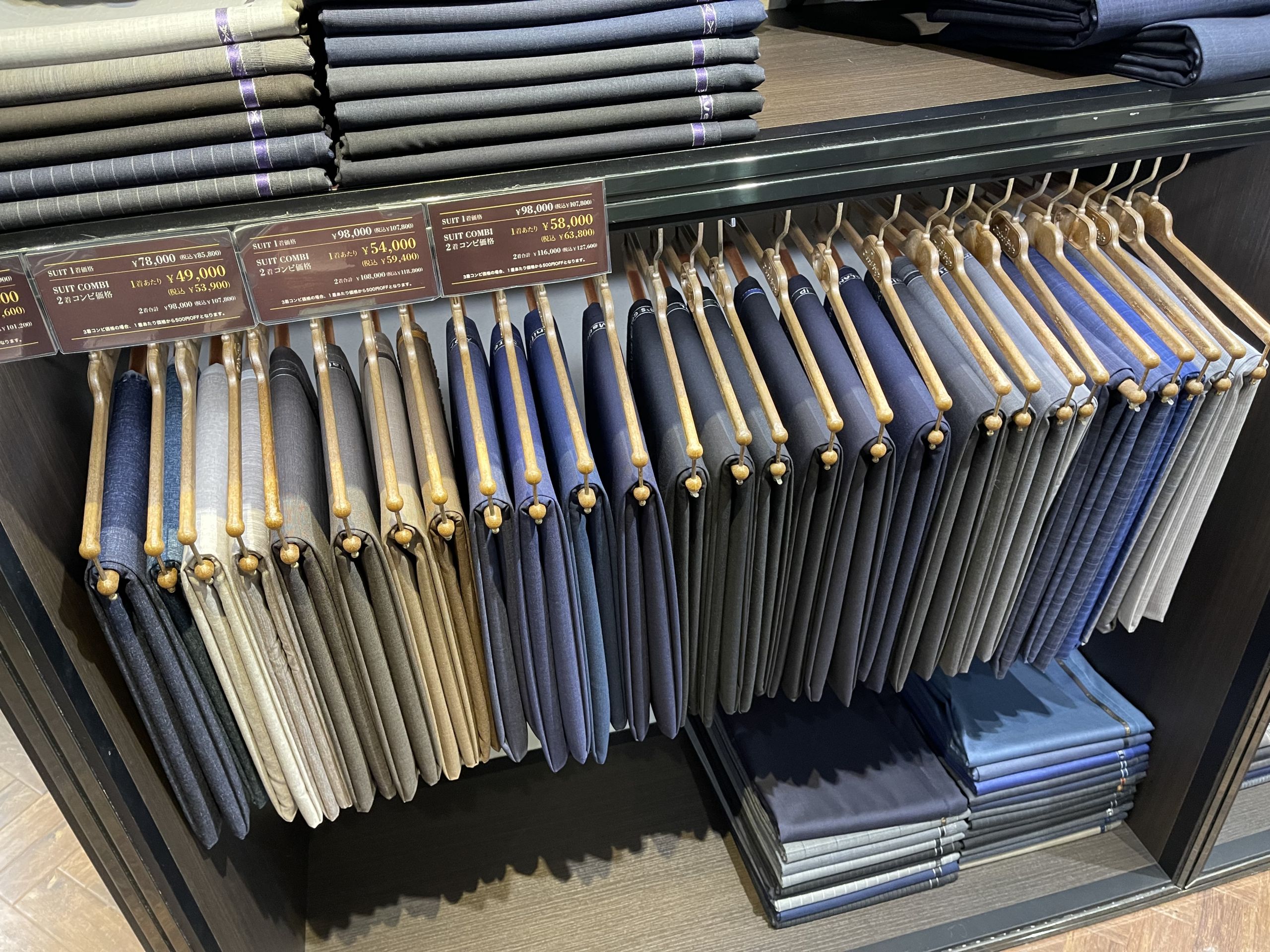 暖かい季節が近づく中、当店では夏専用の什器を設置し、快適で軽やかなスーツをご提案しています。