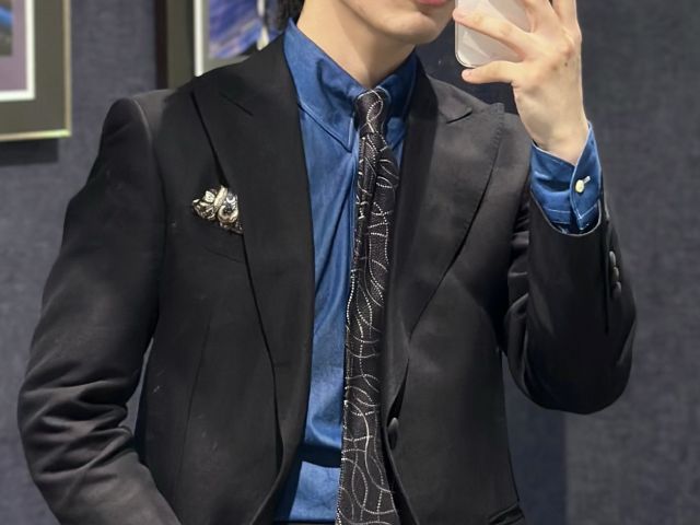 王道なブレザーとの組み合わせもよくしますが、ブラックリネンスーツにもよく合わせます。
