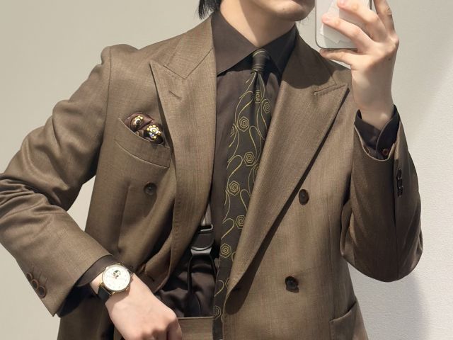 こちらのブラウンシャツは、トーンがかなり落ち着き艶も強く、ラグジュアリーな印象。