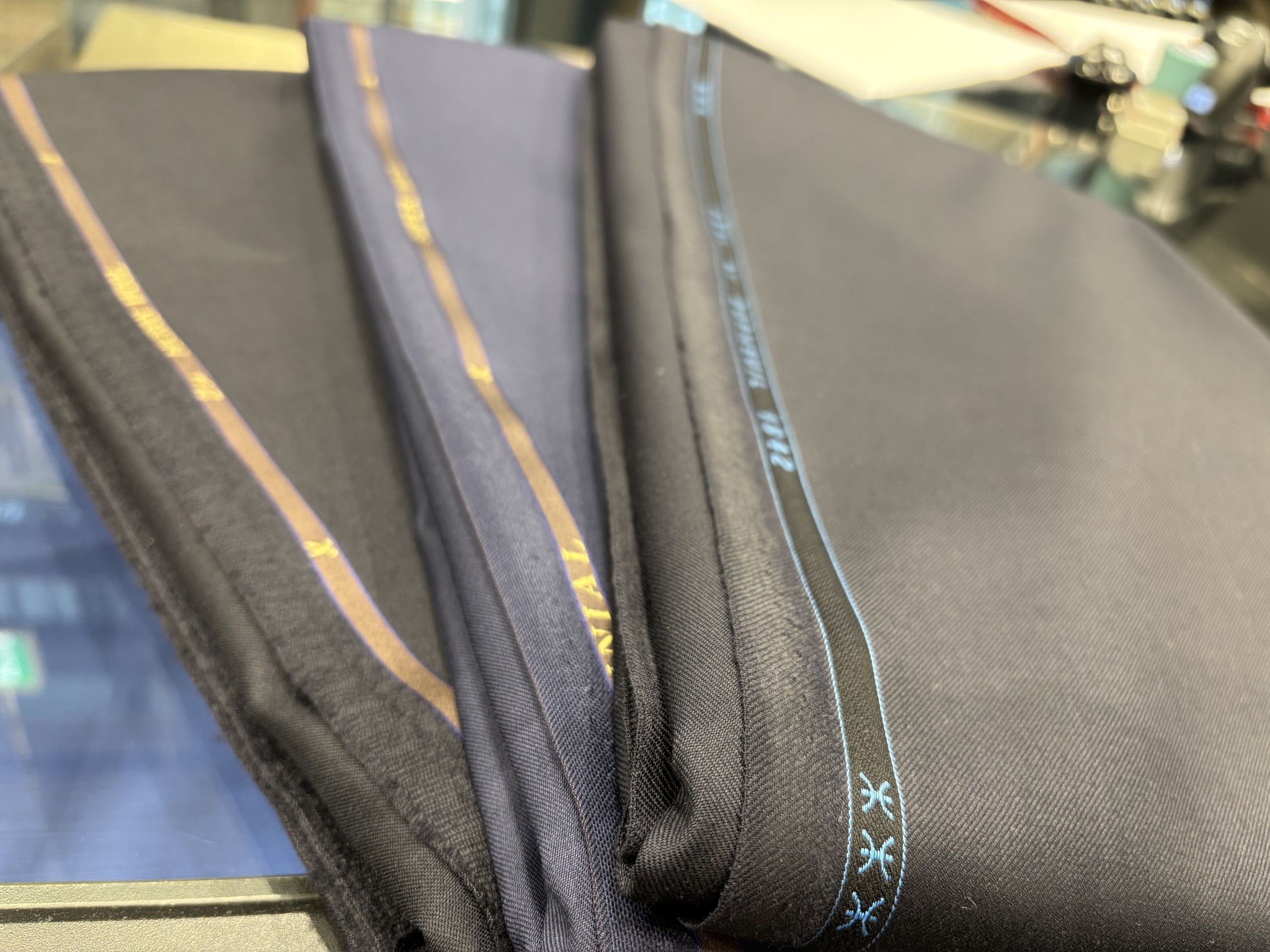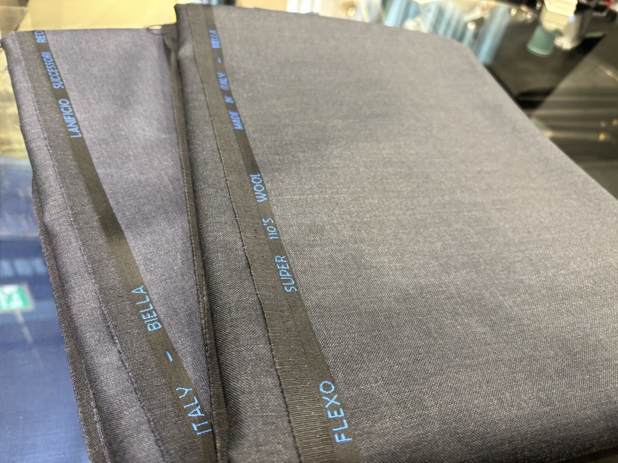ウールの自然なツヤ感のあるネイビー生地で