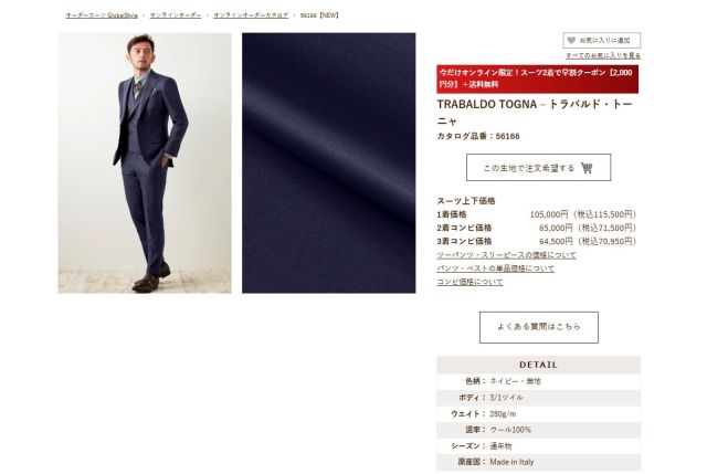 オーダースーツ2着コンビフェア:冬物1着・通年物1着の組み合わせご注文が増加中【オンラインオーダーサービス】