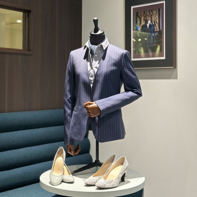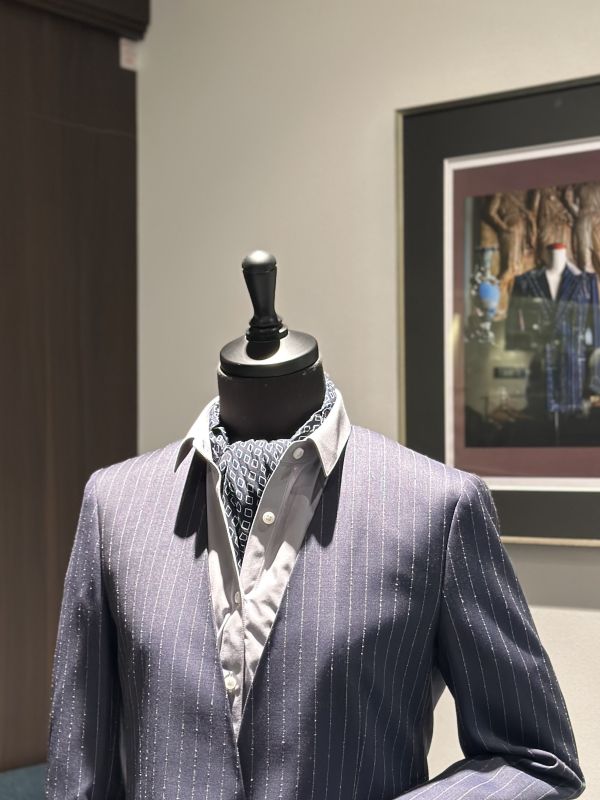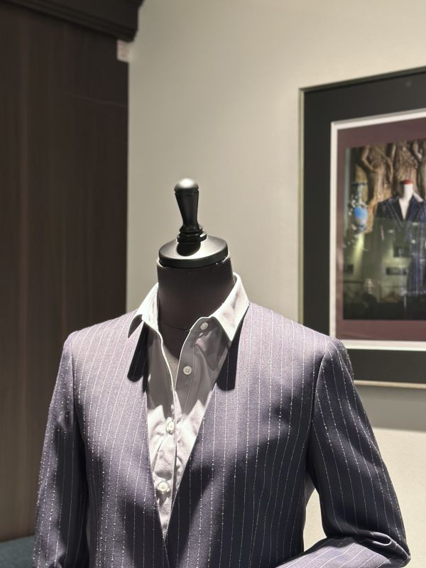 写真の様なノーカラースーツの場合は特にこの”ひと手間”で印象がガラッと変わります。