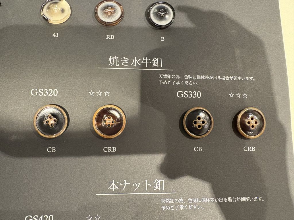 同じく天然の「焼き水牛釦」や「貝殻釦」も人気でおすすめです。
