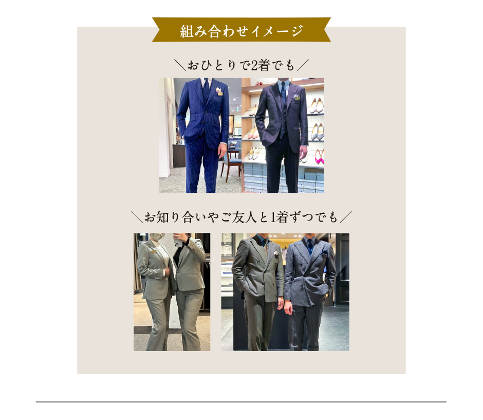 とにかくスーツを2着以上オーダーすればさらにお得にご注文いただけますので、