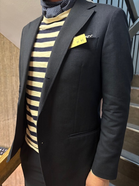 スーツはイタリアのディ・ファビオの生地でウールとコットンの混紡に