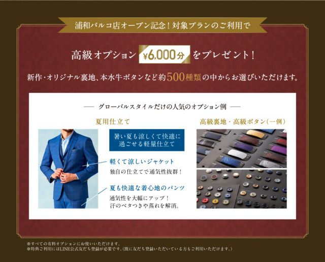 スーツを2着ご購入していただくと、ボタン裏地・オプションが6,000円引きに!!