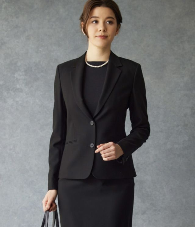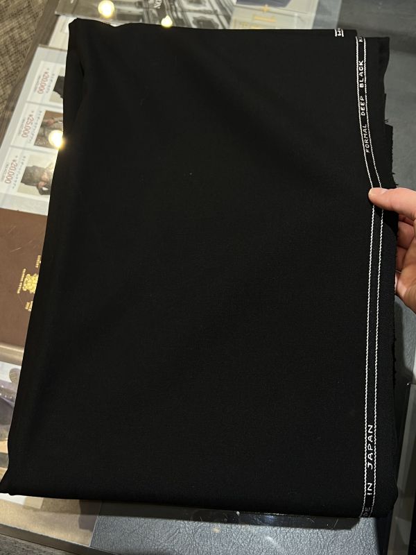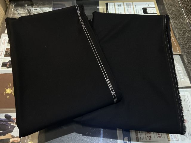礼服用の生地は、ビジネスシーンの黒に比べてより黒に染めた漆黒の色味になります。艶感を抑えたマットな質感の生地を使用します。