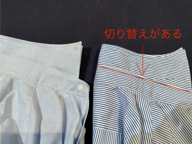 写真にも書いていますが、一般的なドレスシャツは赤線部分を境にパーツが切り替わっています。
