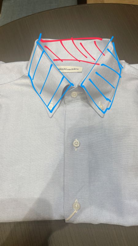 「羽襟」…青く囲った部分、襟の全体。シャツの顔となり重要です。