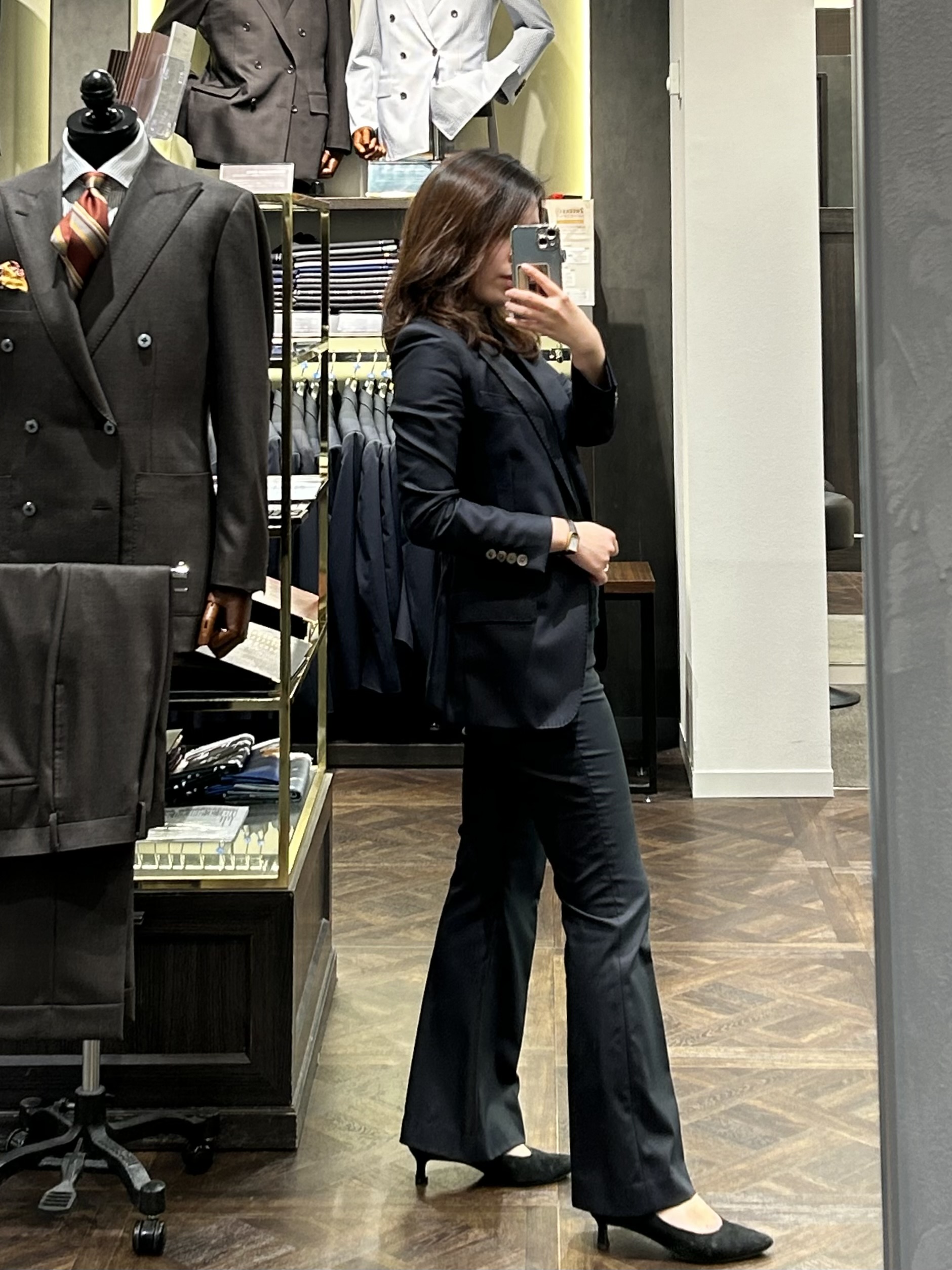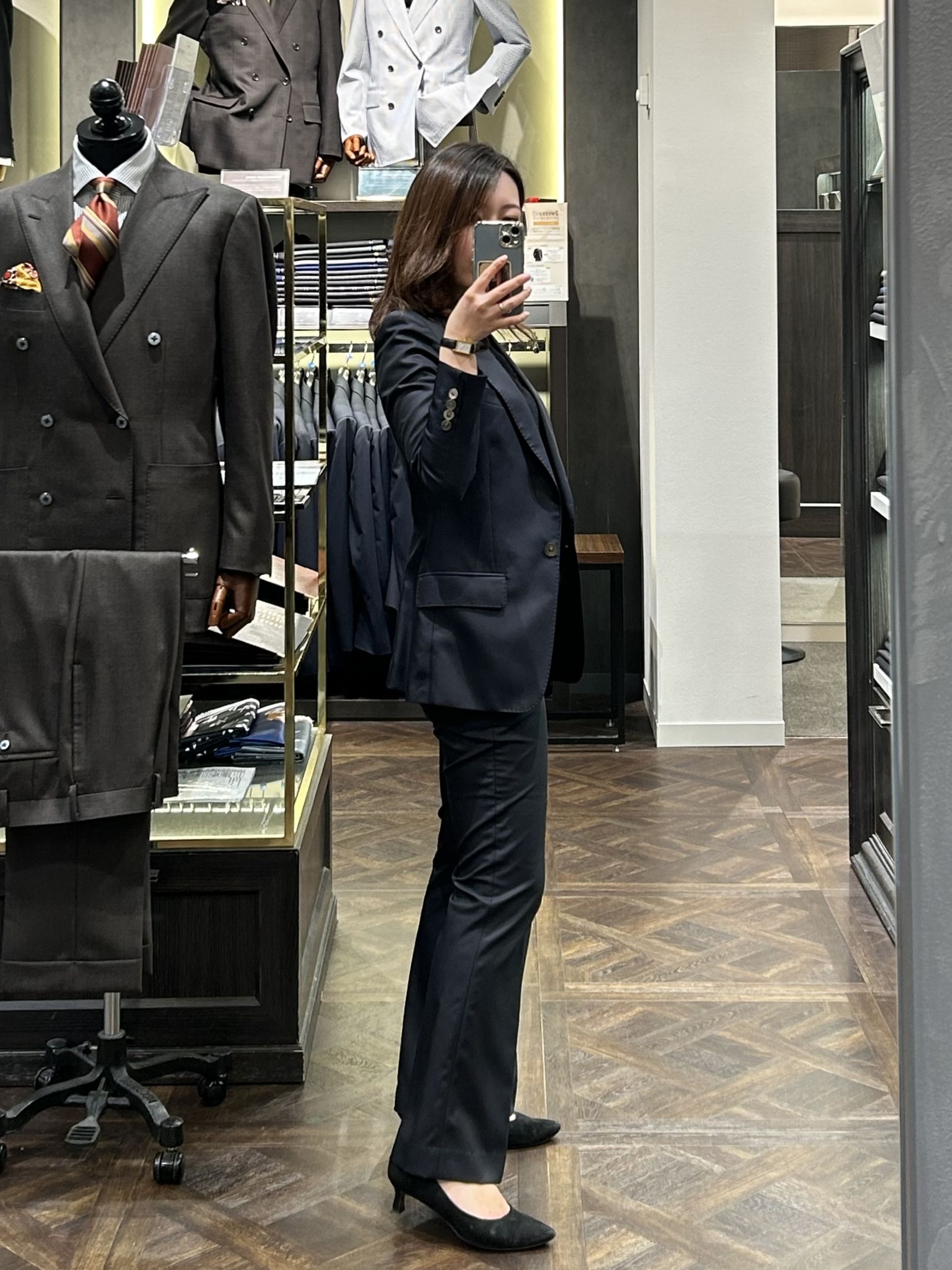 レディースの標準の着丈はおしりの半分より上あたりの長さになりますが、このスーツはおしりの下が少し見えるくらいの長さ、つまりメンズの標準で作っています。