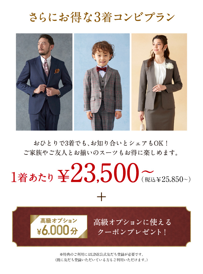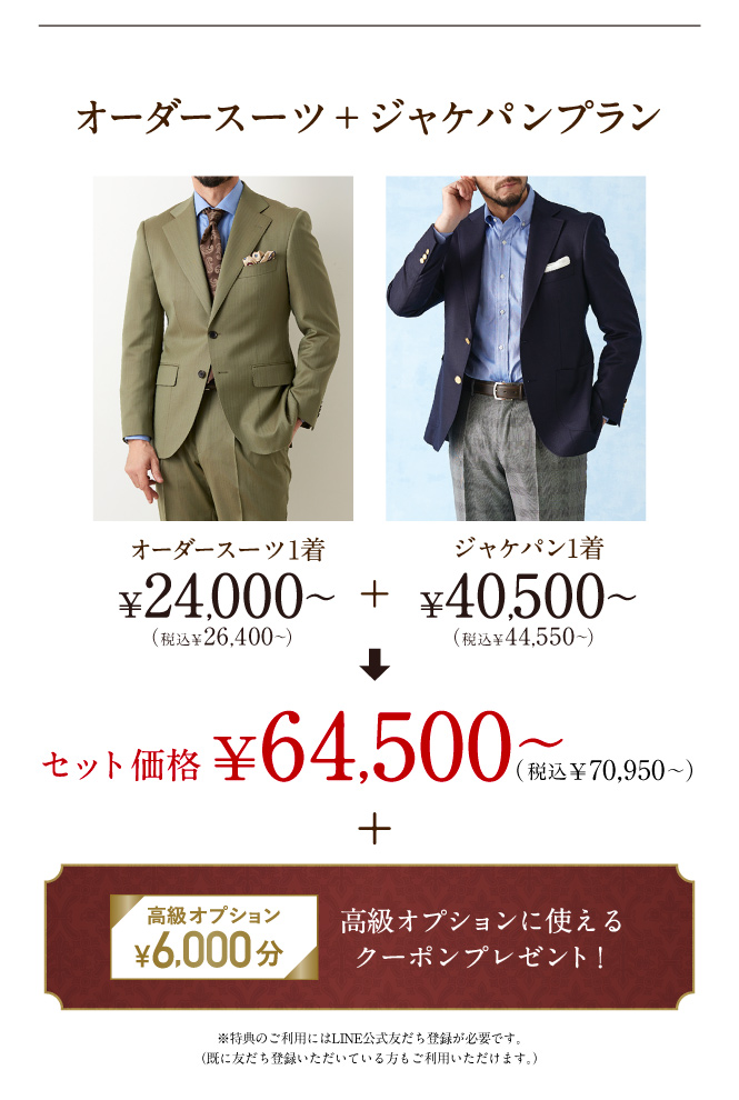 スーツを複数着お買い上げいただくと、公式LINEの登録でオプションが6,000円引きとなるクーポンを配信しております。