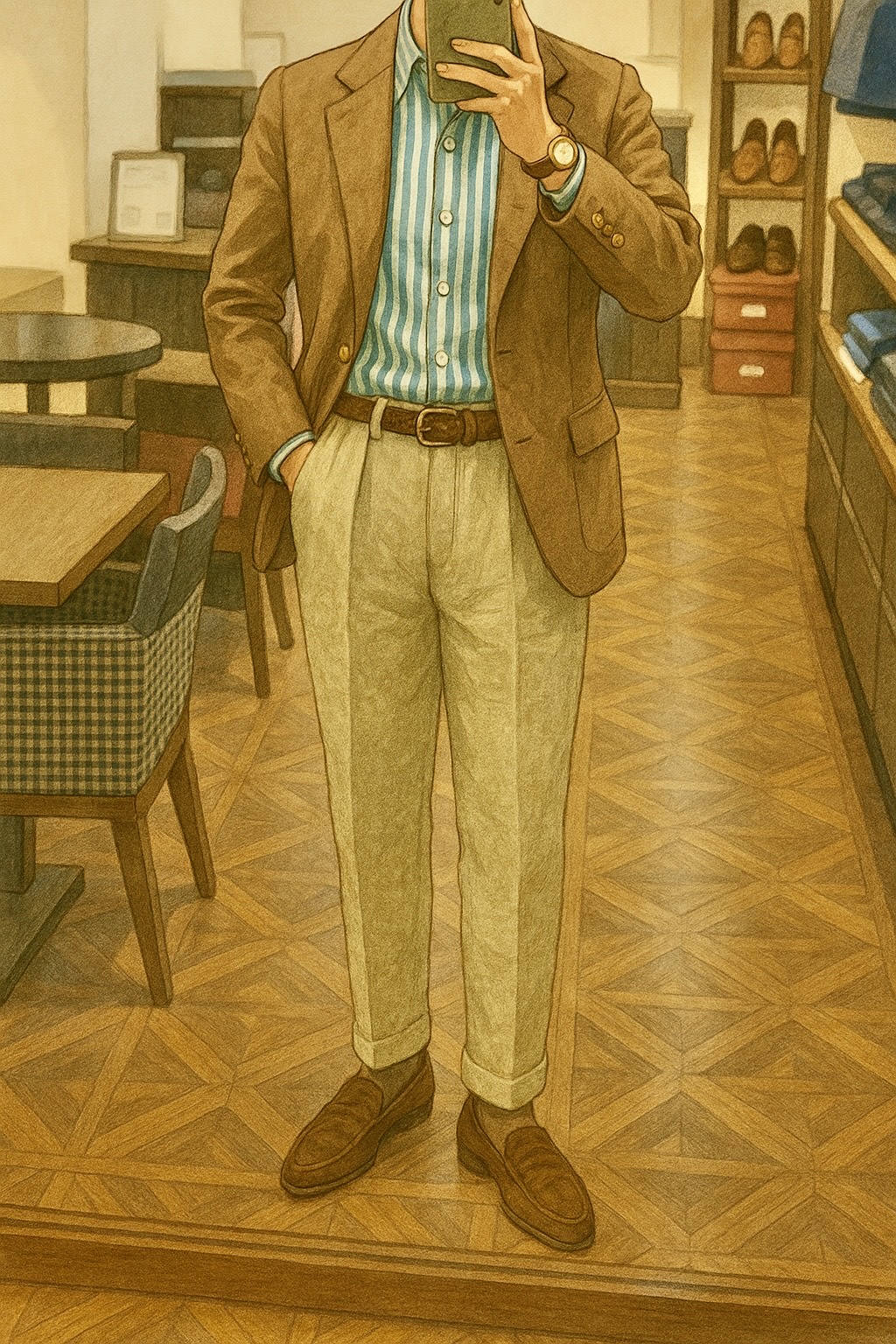 今回私はブラウンのジャケットにアイボリーのスラックスで合わせてみました