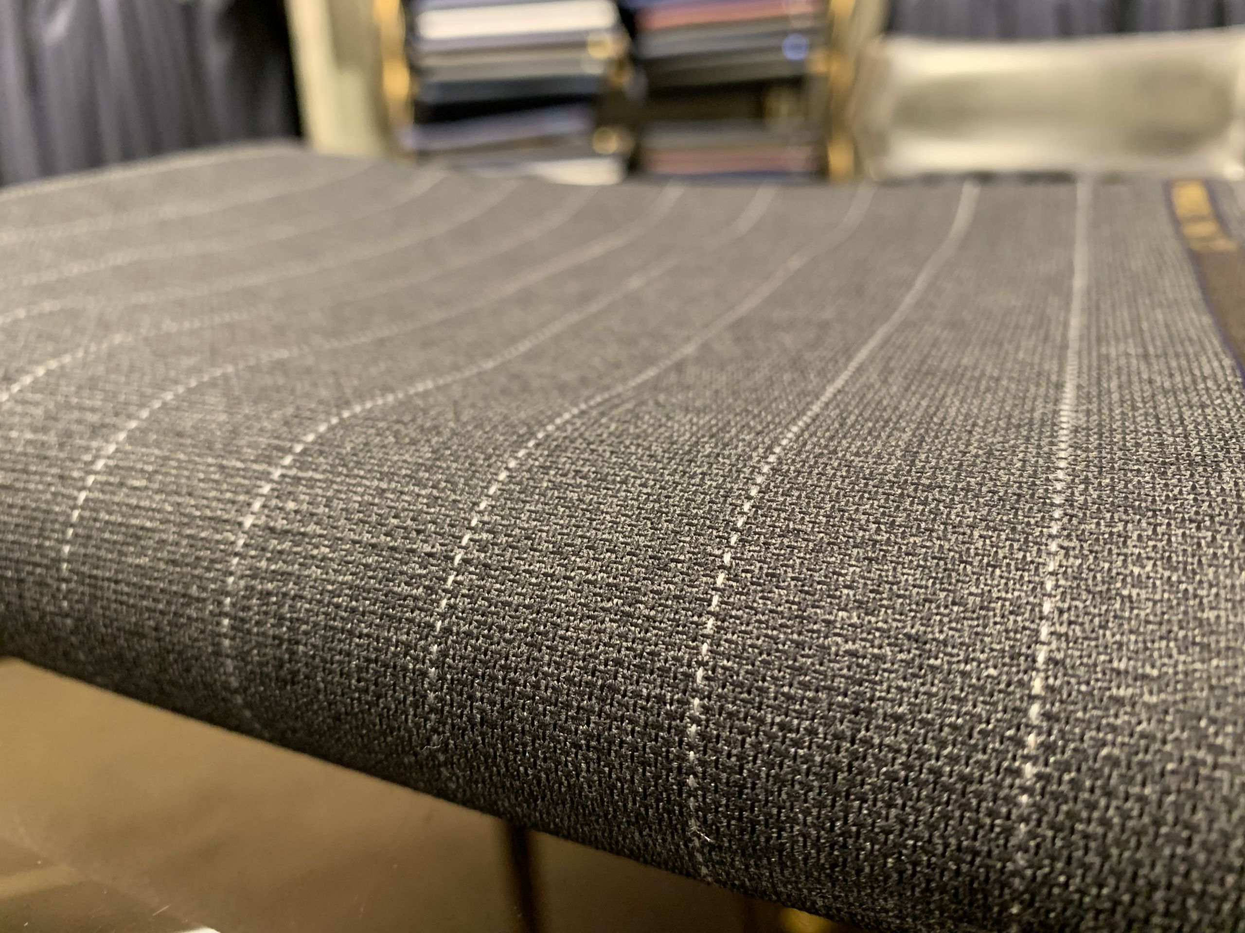 ポップサックのような朱子織のような特殊な織感にピッチ太目のピンストライプ。変わった生地をお探しであれば!