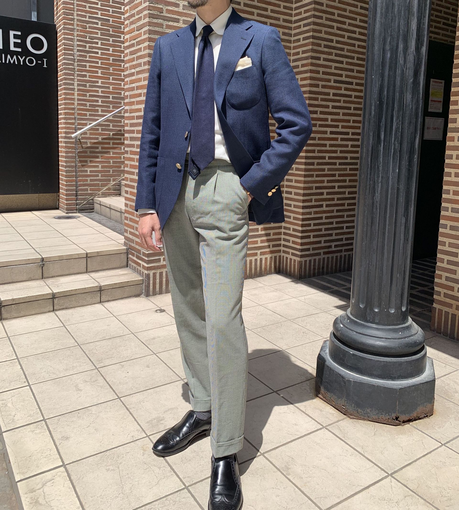 わたくし堀田は紺ブレにハウンドトゥースを合わせて王道のトラッドスタイル。おニュージャケットなのでコーディネートの巾が広がることが楽しみになりません。
