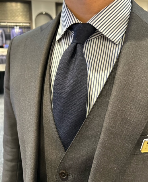 Vゾーンもストライプのシャツとシンプルな紺のネクタイでコーデを組んでみました!!