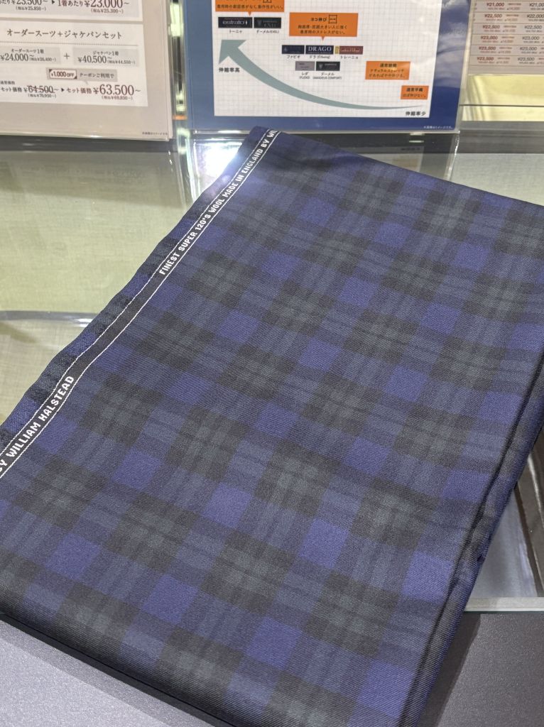 こちらのウィリアム・ハルステッドのネイビーチェックの生地になります。こちらはアンコンモデルのダブルで作りたいと思います!