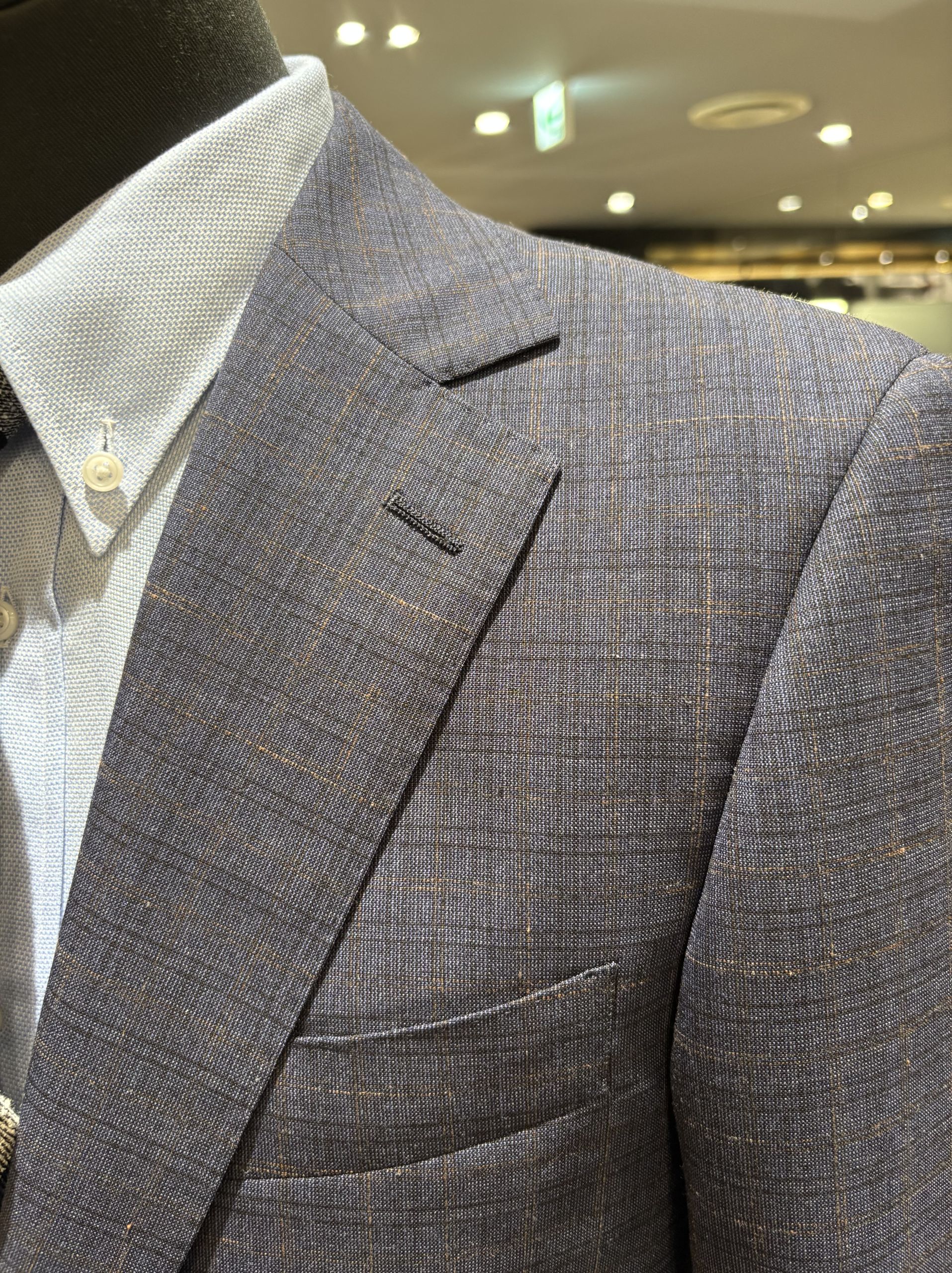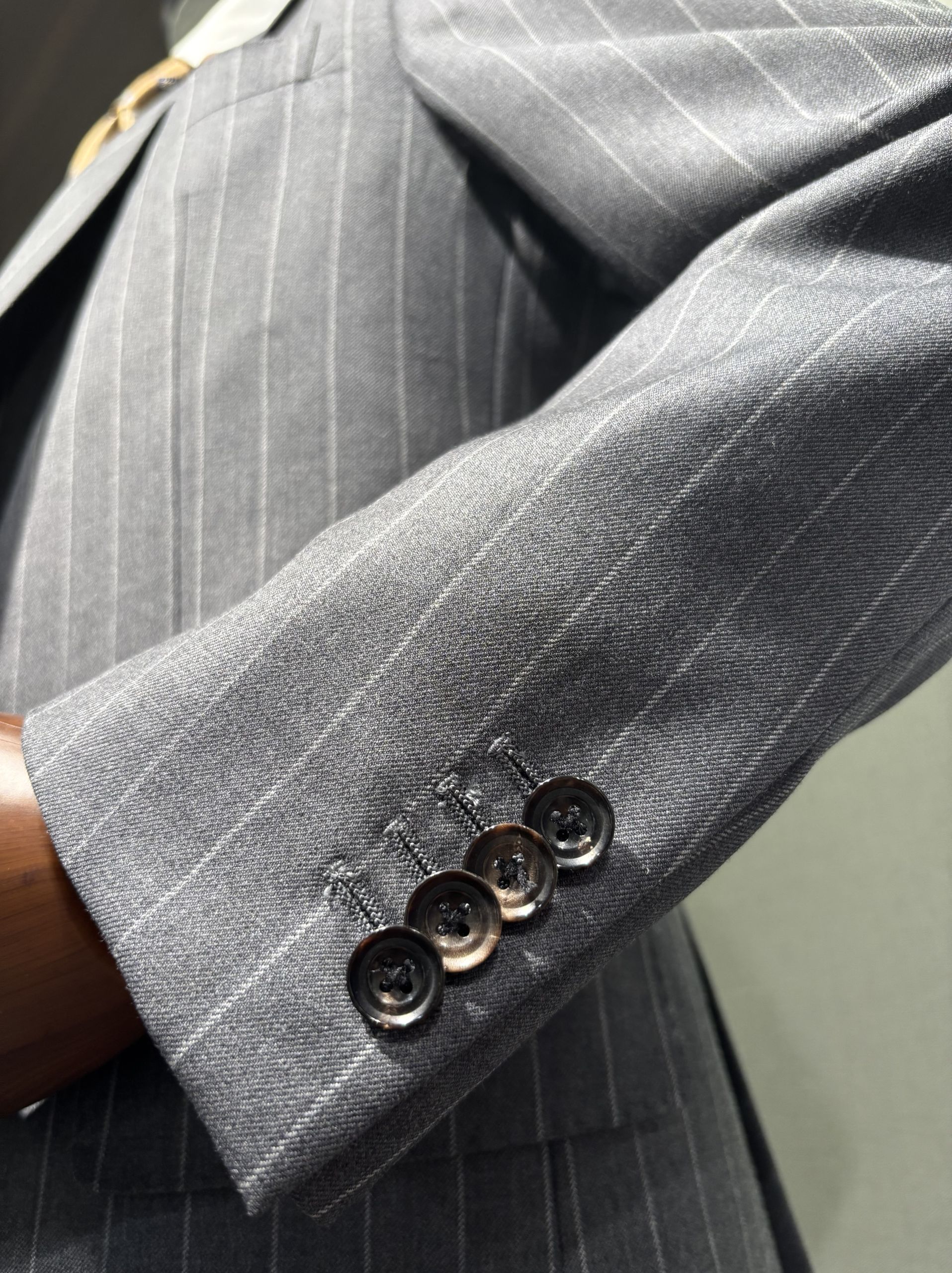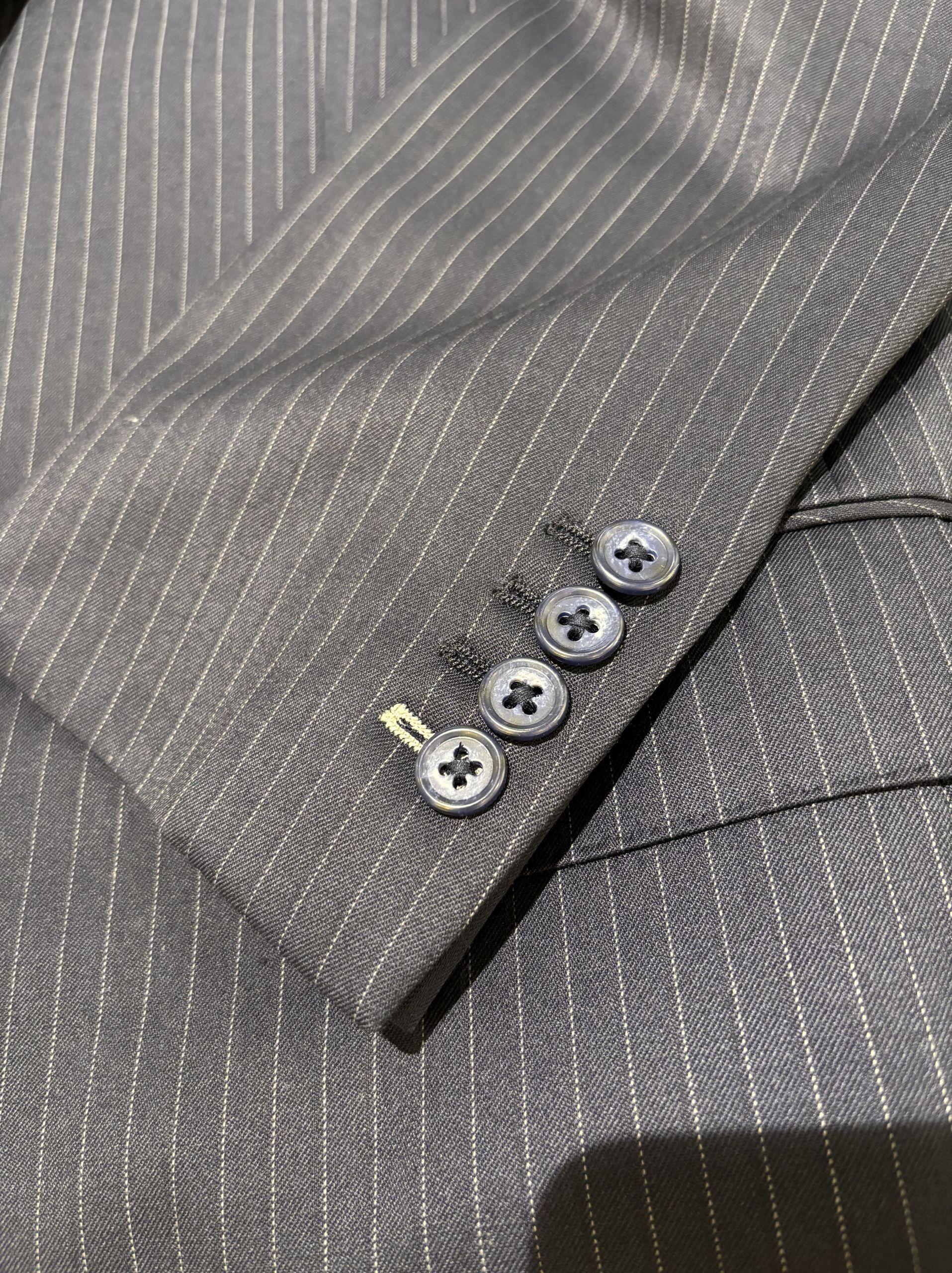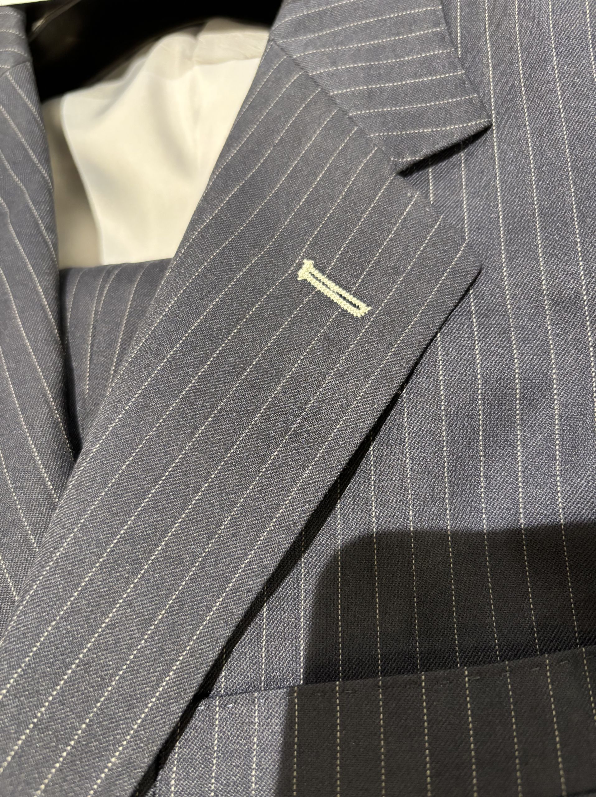 通常、スーツのボタン留めの穴かがりは生地の色に合わせ