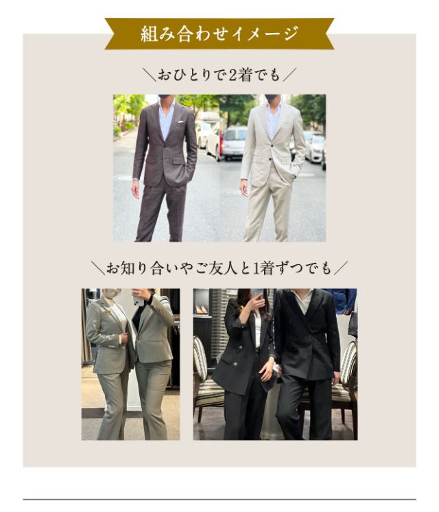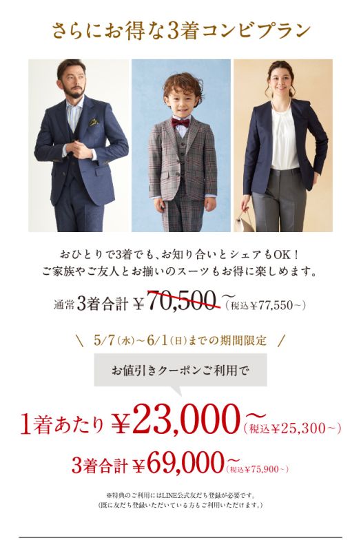 スーツを複数着お買い上げいただくと、公式LINEの登録で1,000円引きとなるクーポンを配信しております。対象プランは以下のとおりです。