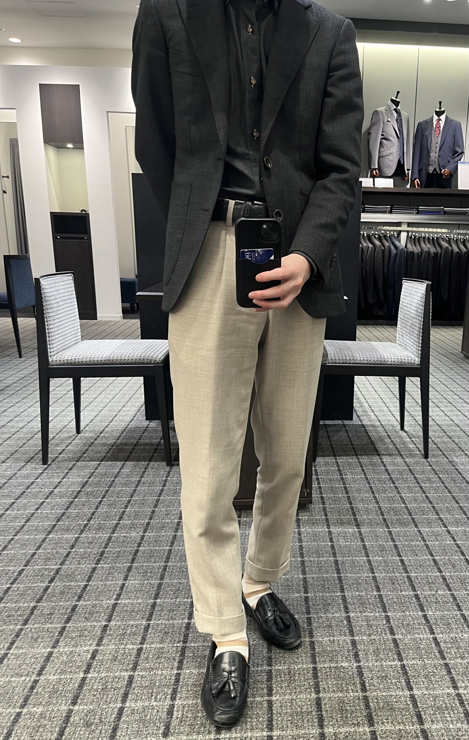 ちなみに本日の私のコーデはジャケットの色味こそ落ち着きのあるグレーですがこちらは夏用生地、さらにスラックスをベージュにすることで夏っぽさをプラスしています。