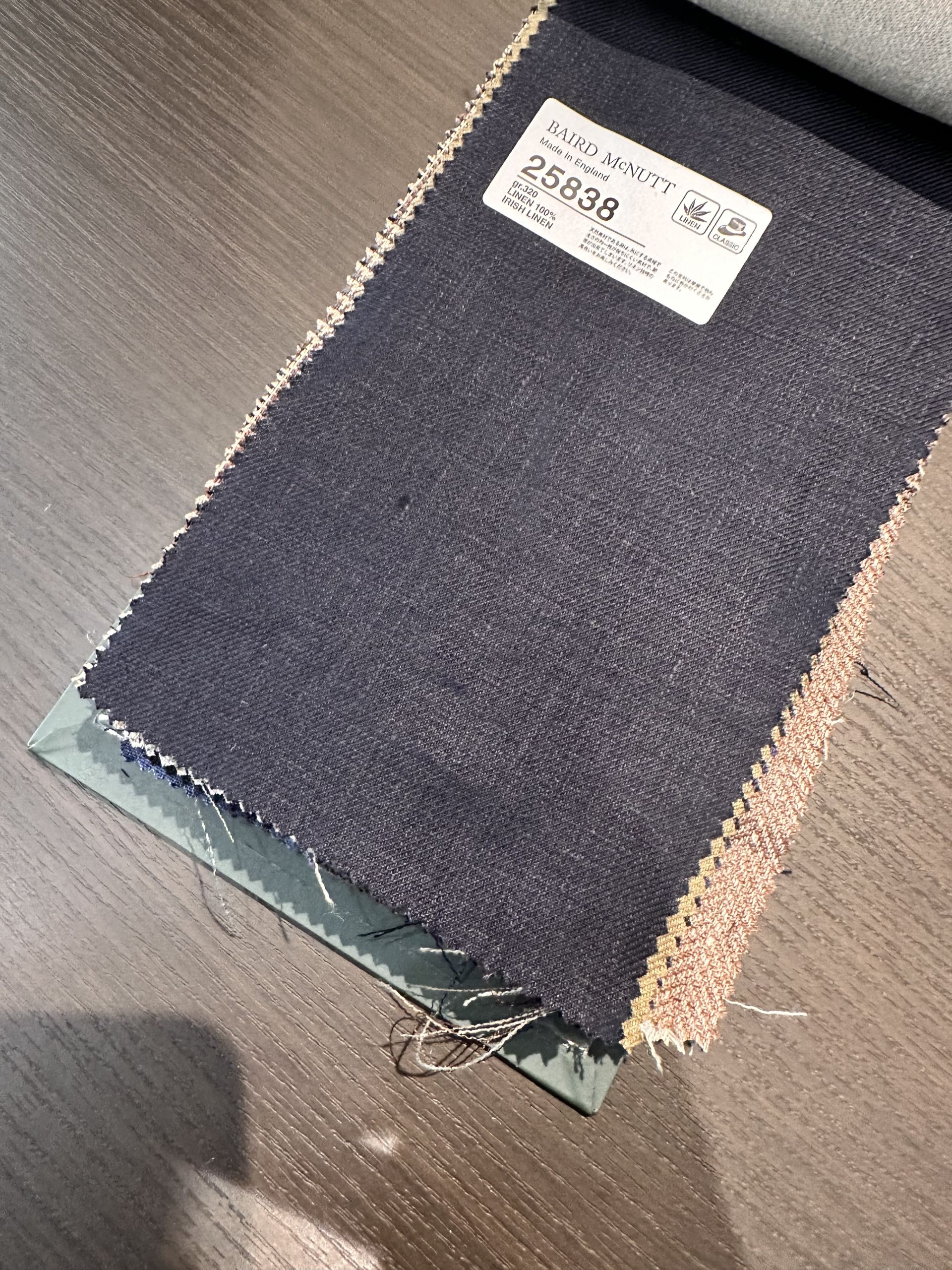 前回は英国が誇るアイリッシュリネンの王様と謳われるスペンスブライソンにてマルーンレッドのジャケットでしたが、今回は真反対のダークネイビーにしております!!