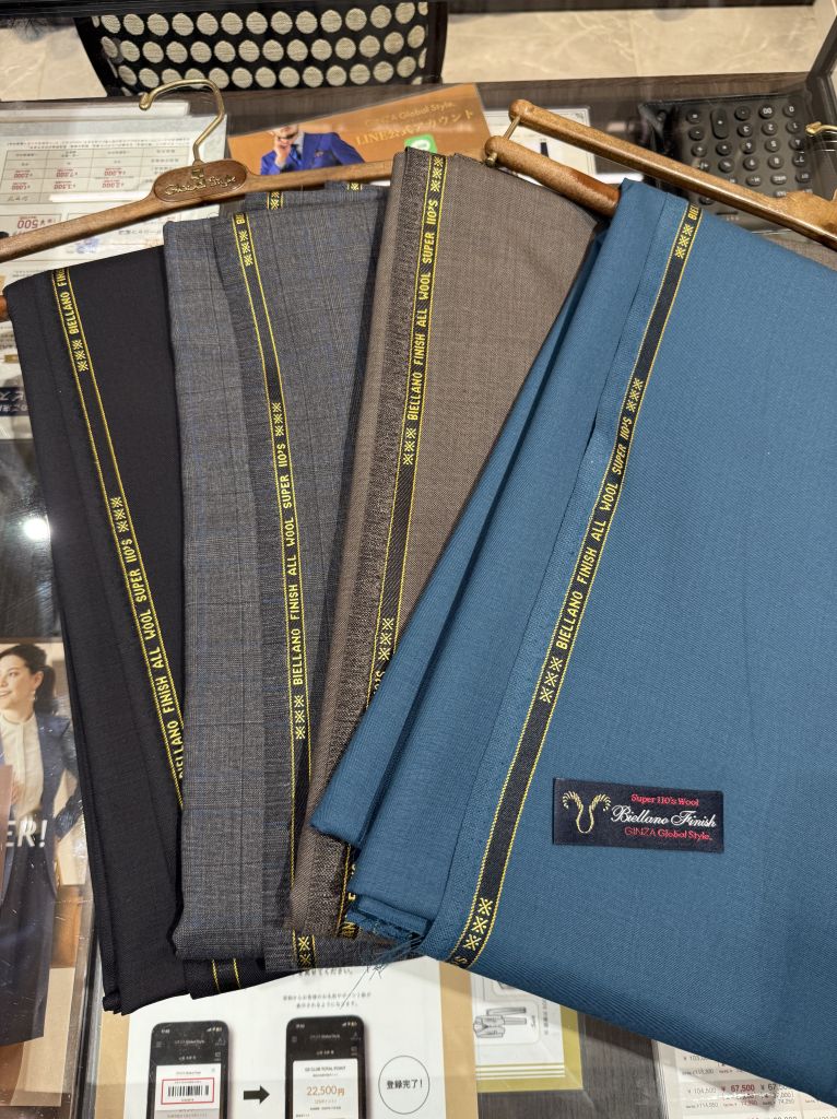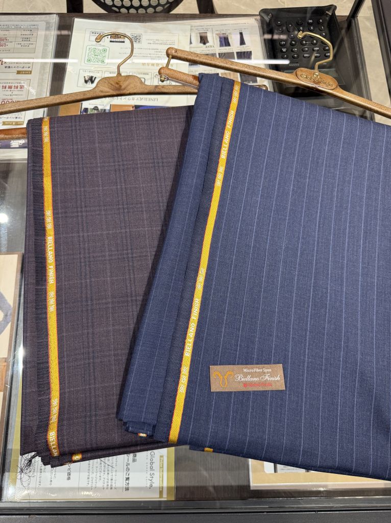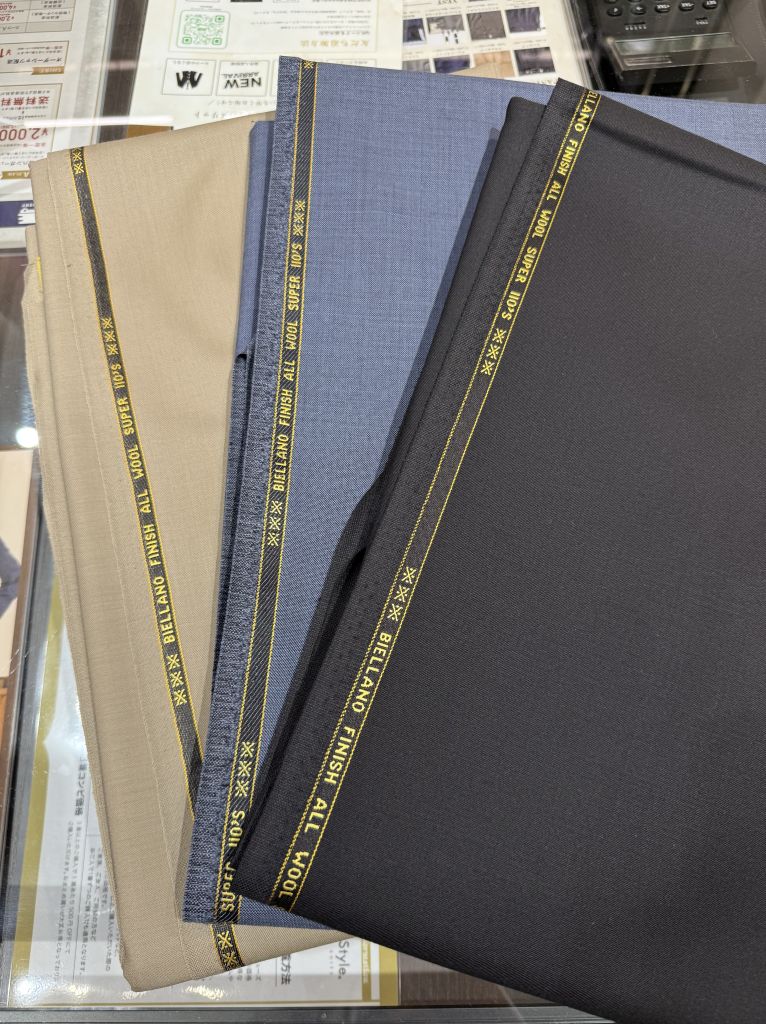 現在、店頭に並んでいるものは、①ウール×ポリエステル混紡生地、②ウール100%の春夏生地、③ウール100%の秋冬生地、に分かれています。