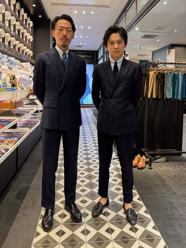 ダークネイビーのダブルスーツにシャツもSAXでネクタイがきれいに見えるタブカラー。