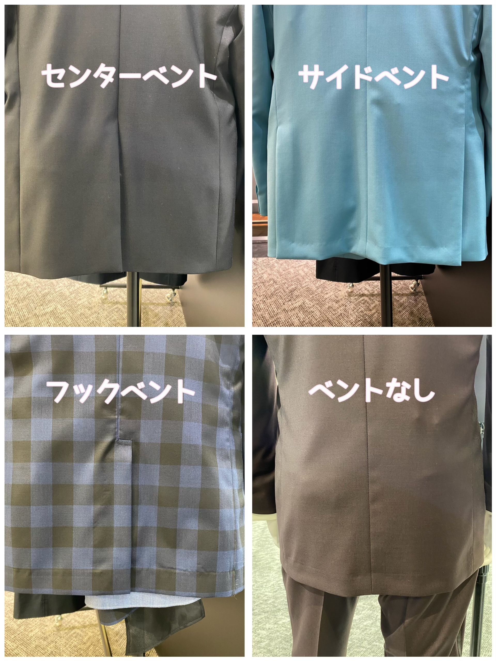 なかでも私はベントの効果について新しく学ぶことがありとても興味深く感じました!ご存知の方もいらっしゃると思うのですがベントとはジャケットの背中側の裾にある切れ目を指します。