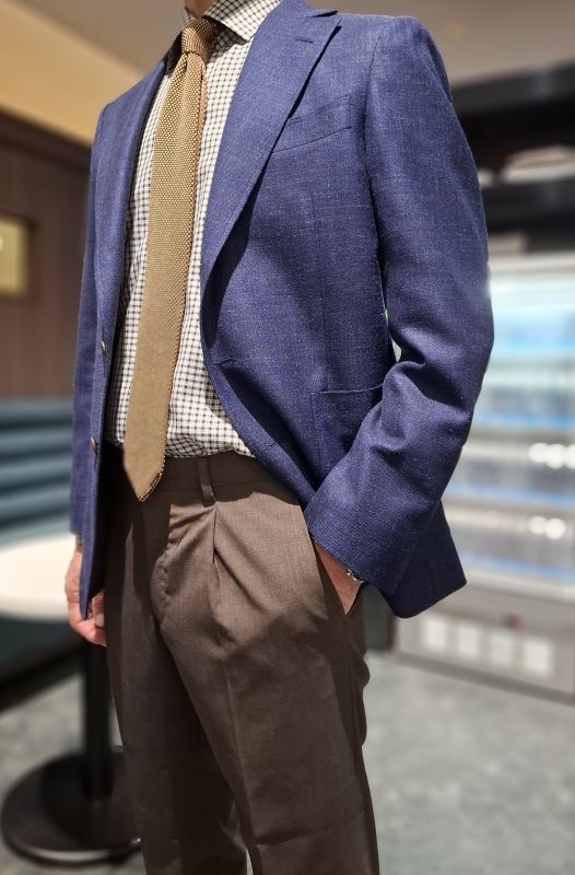 紺系のジャケットは、シャツやネクタイ、パンツの