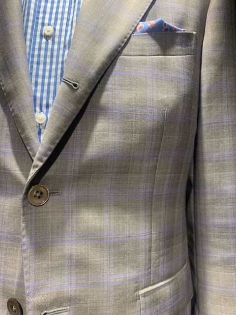 白やベージュ中心で、釦の色も同系色で揃えられる中、鮮やかな紺と黄緑のチーフがアクセントになっています。