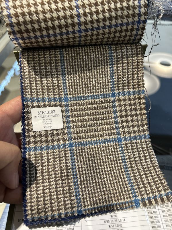 絶妙な色ではないでしょか、ベージュに水色。夏らしい色使いにリネンシルクウールの三者混です。