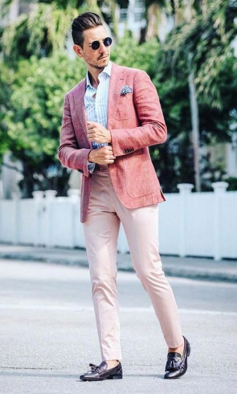 ピンクジャケット×ライトピンクパンツの合わせ方です。