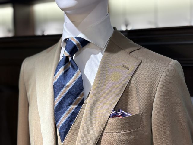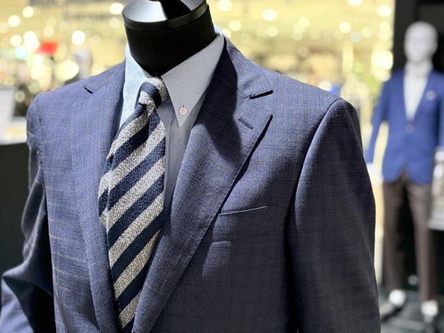 こちらが艶感に乏しい春夏向けの平織りスーツと相性が良く、Vゾーンがスポーティで軽快な印象に変わります。