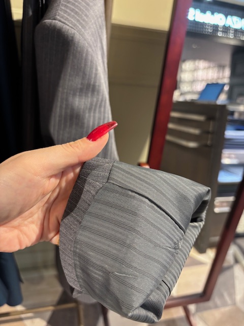 こんにちは(^^)/ 萩原です!!! 本日は、私のスーツこだわりポイント紹介です!!! まずは・・・袖裏も裏地と同じ生地にしてます!! めっちゃ暑がりなので夏場など すぐに腕まくりしちゃう為です((+_+)) 折り返して着るだけでも、裏地が見えてかわいさUP 女性の方でしたら手首を見せてさらに女性らしさUP☆ 本来、指定しなければ袖裏は こんな感じの生地になってます。 ↓ ↓ ↓