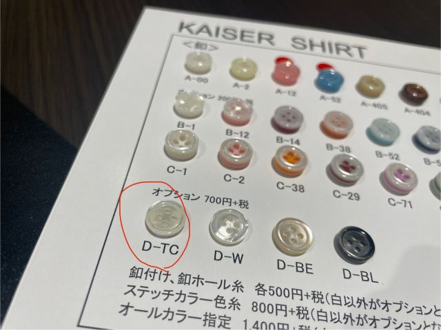 最後にシャツ全体の釦は貝釦にして高級感をプラスしました♪