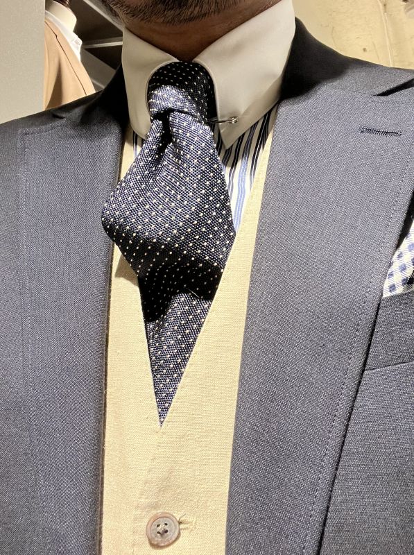 ネクタイはネイビーのピンドットで、ドットの柄が小さいのでフォーマルな
