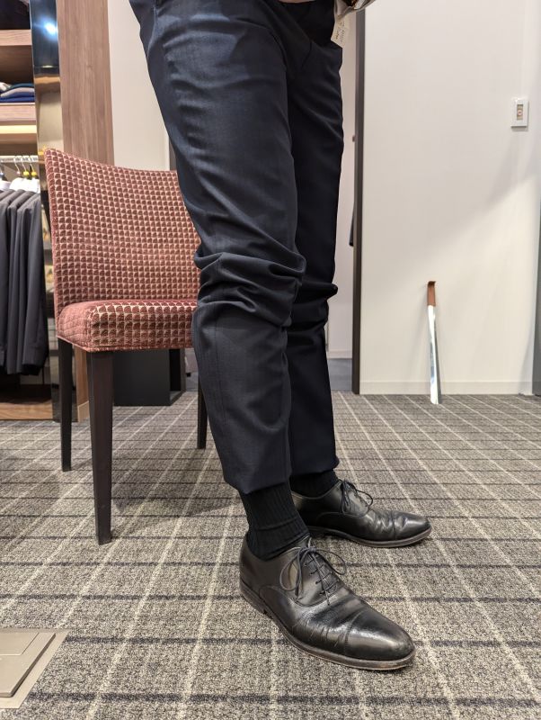 日本人はO脚が多く、裾口を細くすると足の外側から内側にかけて斜めに捻った皺が出ます。