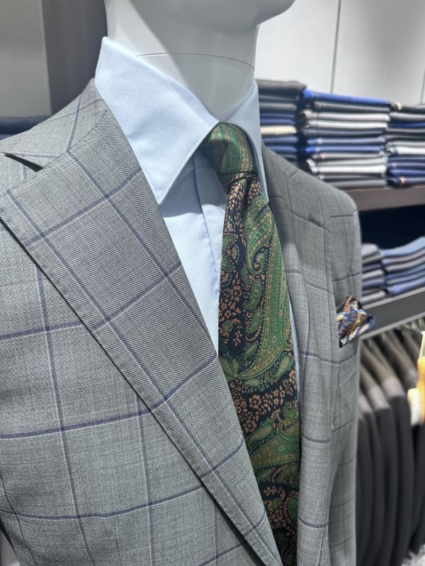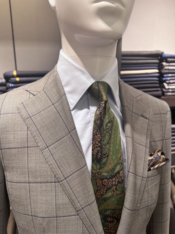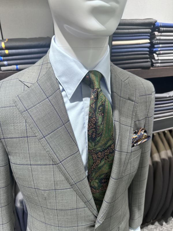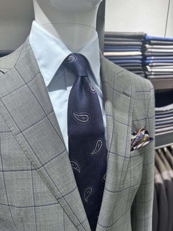 結び目がやや大きく、襟元に自然な立体感が生まれます。ビジネスシーンでも非常に好印象なスタイルです.