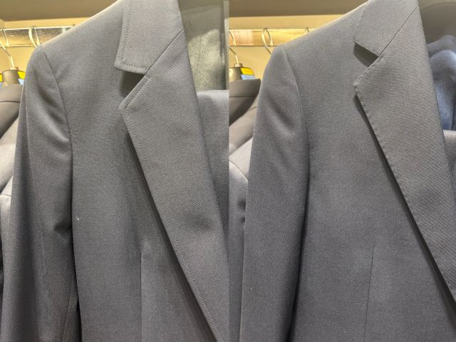 メンズスーツは立体美を出すため”毛芯”という張りのある副資材を中に仕込んでおります。