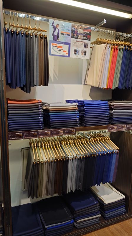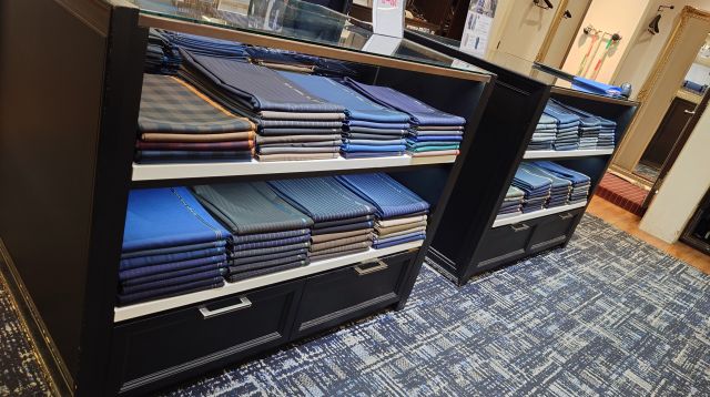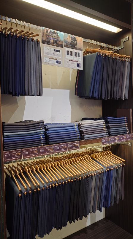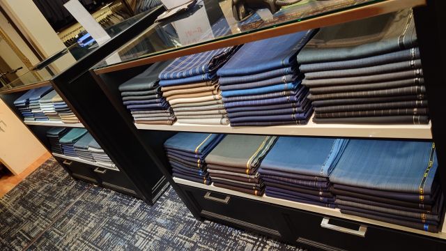 弊社は大きく生地をカットし店頭に置いているので、よりスーツの仕立て後のイメージが付きやすくなっております