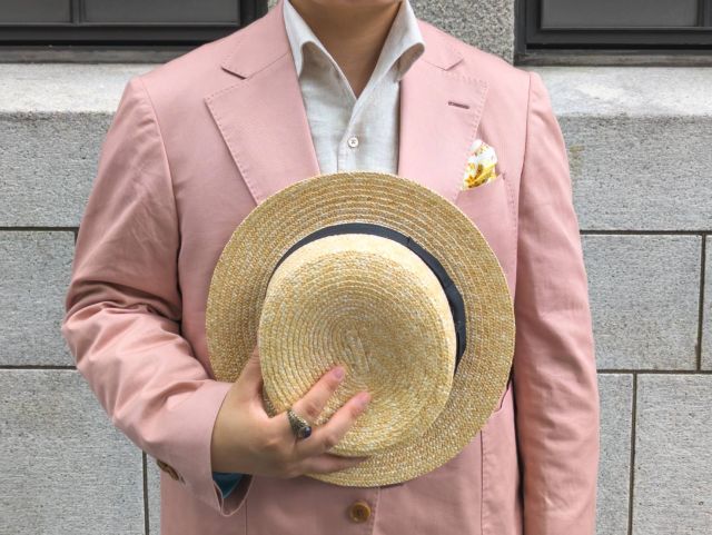 店長からはイタリアンカラーのリネンシャツ&チーフ&カンカン帽の組み合わせがおしゃれと伝授いただきましたので小物アイテムも頑張って集めてみました!