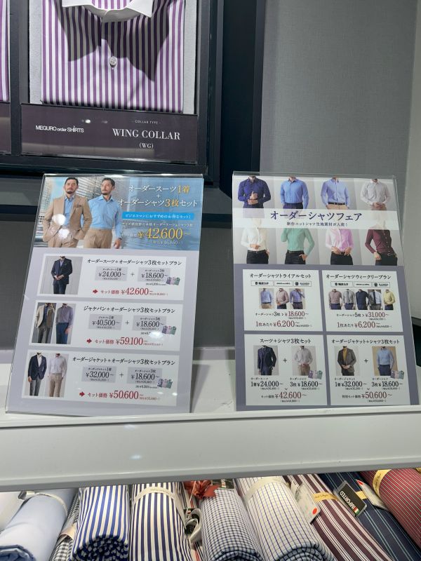 また、オーダースーツ1着(上下)+シャツ3枚のフェアがございます。(ほかの組み合わせもございます。)