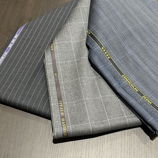 左から、こちらもトラベルウールのグレイストライプ、カノニコのグレイチェック、ゼニアのブルーグレイのチェック