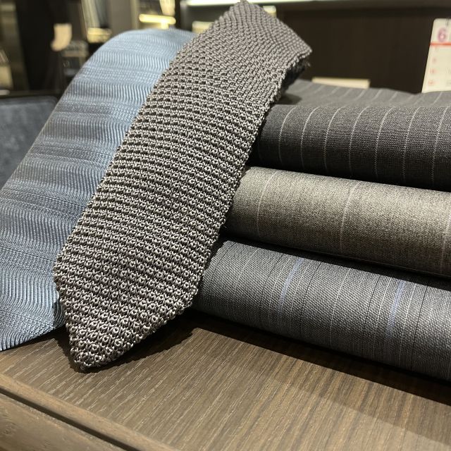 ネクタイ左はサックスブルー、右はグレイのニットタイ。
