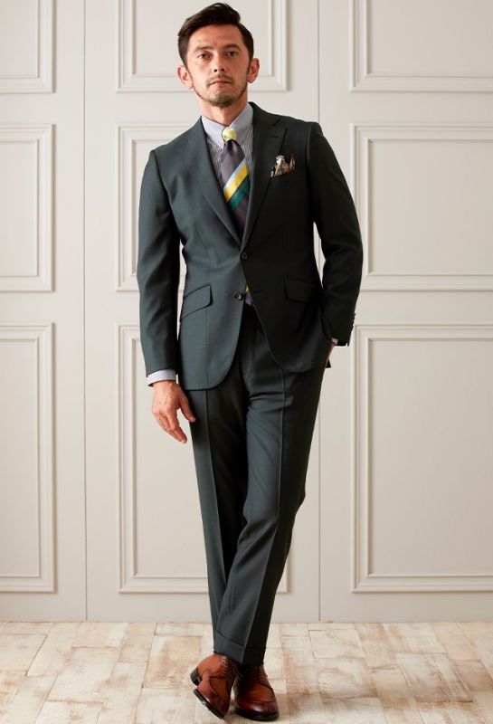 グリーン(カーキ)スーツは、スーツのカジュアル化の傾向から人気が上がり、着用している方が増えてきています!