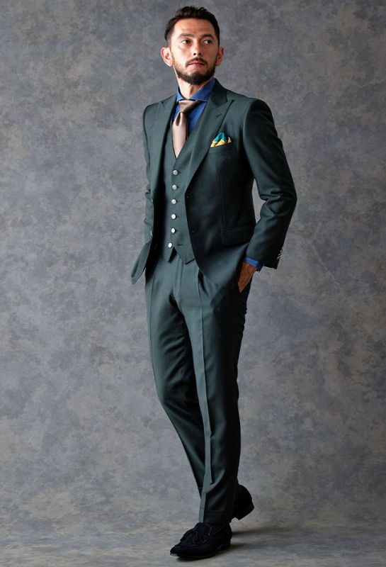 グリーン(カーキ)スーツは、”個性”を出しながら”オシャレさ”を磨くことができるスタイルになります◎