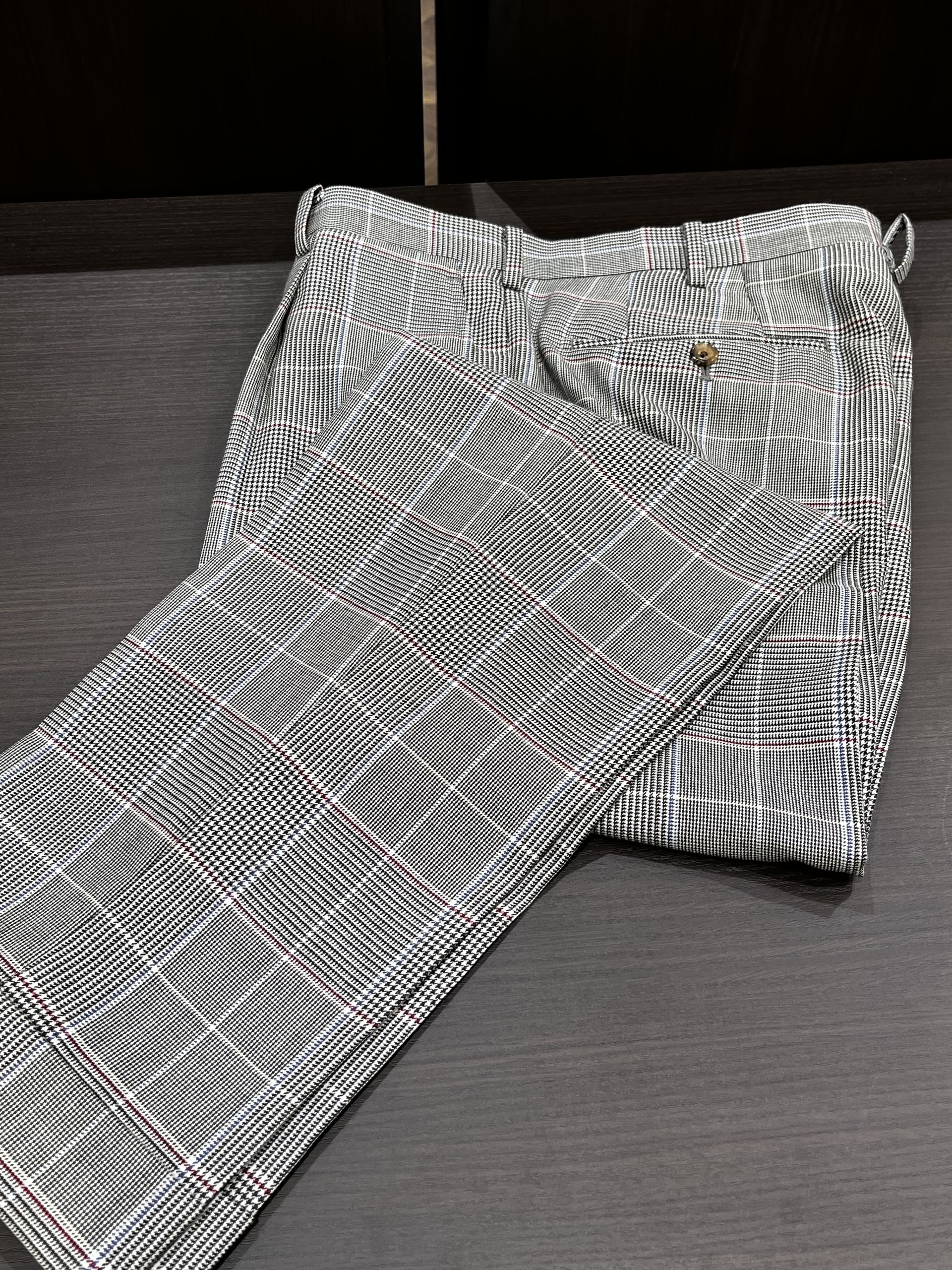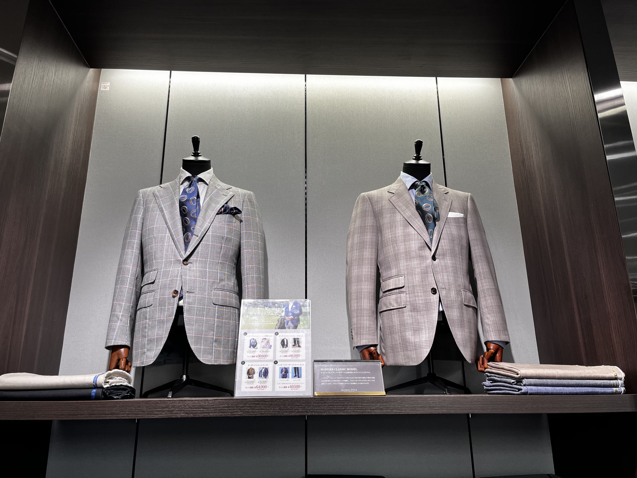最後に、皆さんお気づきの方もいらっしゃるかもしれませんが、今回合わせたスラックスは1枚目の画像左のマネキンと同じ生地なのです。つまりスーツとしてお仕立てしたものがスラックスのみ、さらにはジャケットのみとして着まわせるのです。