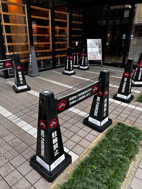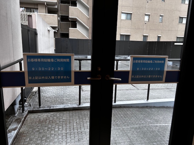 施設入口はこのような駐輪禁止マークが掲載されておりますが、よく見ると『当建物のご利用者以外の駐輪はご遠慮願いします』との記載がございますが、この出で立ちですと駐輪するのも少し抵抗があるかもしれません。