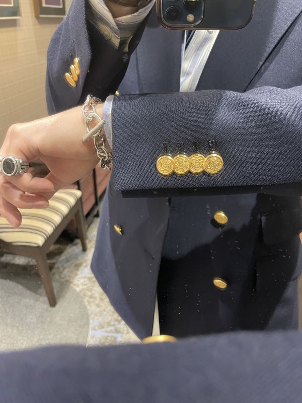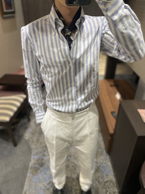 デザインは今回のコーデに合わせる用に仕立てたのでノータイでボタンを開けても衿がへたりにくいようにボタンダウンのスナップ釦に♪