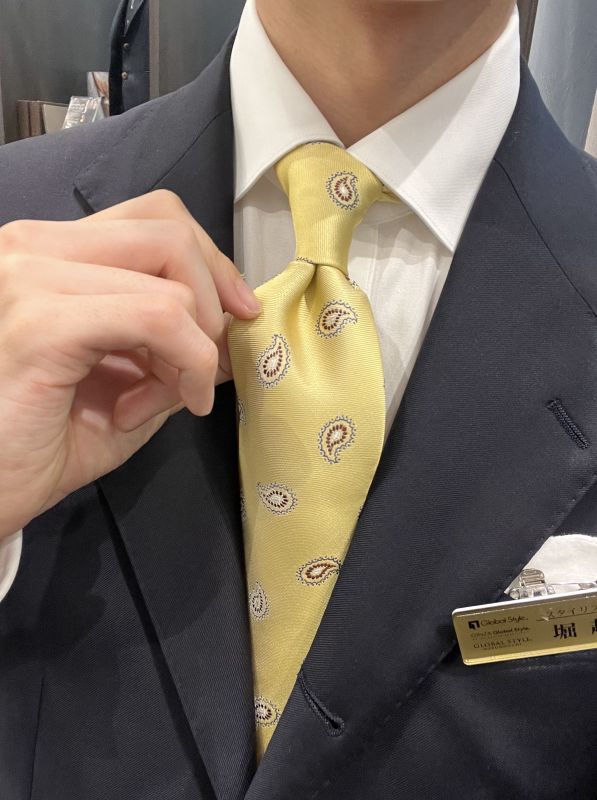 僕が普段紺無地ネクタイばかりなので、この黄色でVゾーンが華やかなになって元気が湧いてきます。